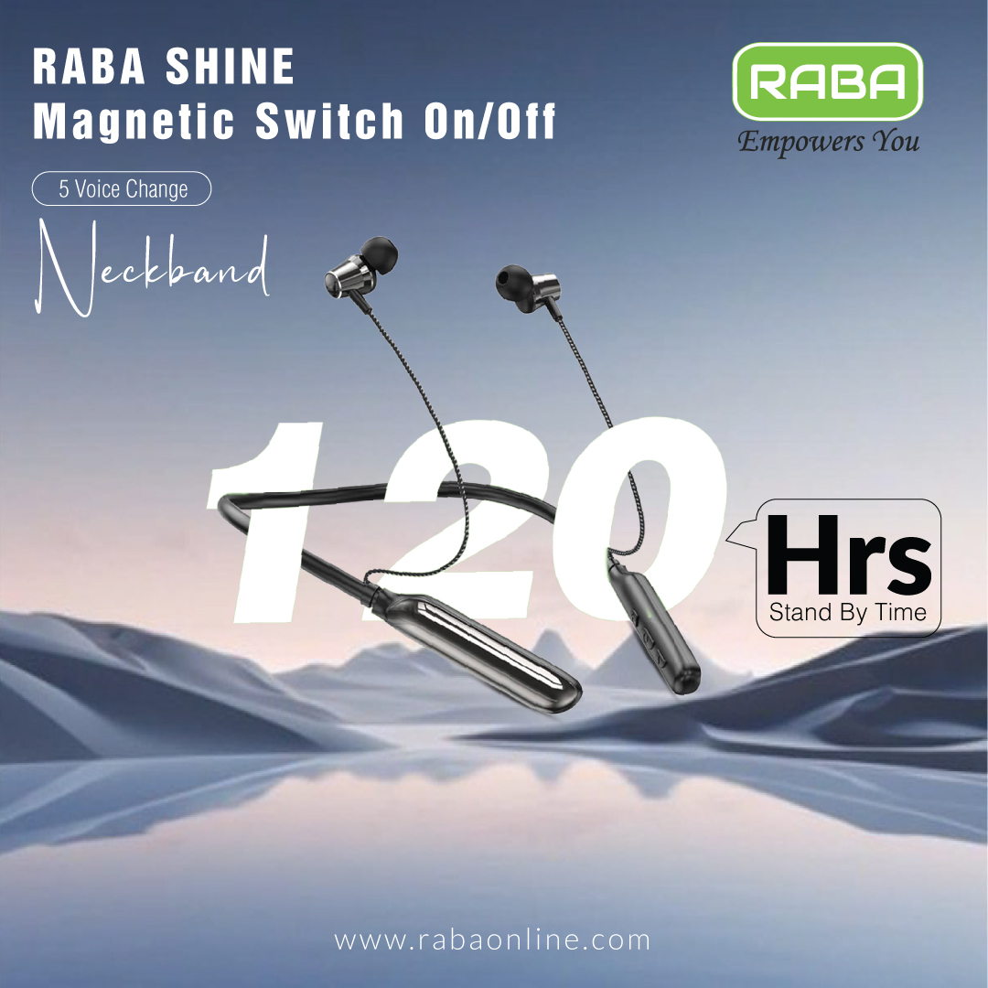 RABA SHINE 120H Magnetic On/Off Neckband. Designed for young, energetic users, this neckband combines style, comfort, and powerful performance. With 120 hours of massive playtime, you can enjoy uninterrupted music, gaming, or calls for days.